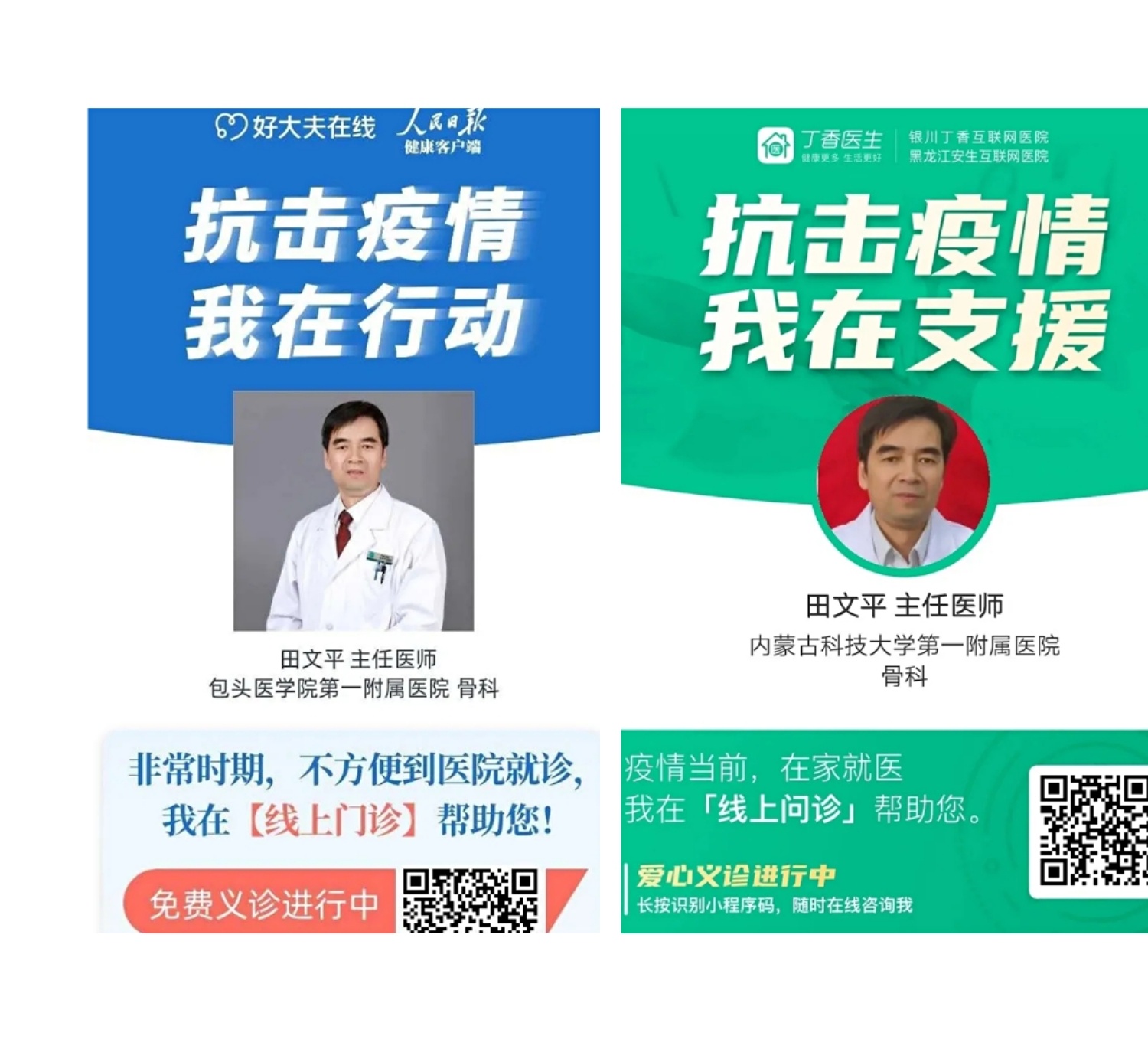 1月26日,医院党委发布《万众一心,抗击疫情,致全院医护人员的倡议书》,田文平科长积极响应号召,第一时间报名。1月27日初三、2月3日、10日...始终坚守骨科专家门诊第一线,积极报名我院与好大夫、丁香医生网络平台,义诊数百人次。并积极发文十余篇进行新冠肺炎防控知识科普宣传。防控期间,积极参加门诊预检分诊工作,因周一到周五工作繁忙,主动要求排在周六日,放弃休息时间。当有人问:为啥你也干这?他回答:大家都在做啊,我们不能喊口号,我在这儿一天能让其他的孩子多休息一天。他每天来的最早,走的最晚。时刻以战时状态,无怨无悔当好“守护人”,用行动诠释着职责与使命,用担当坚守岗位。