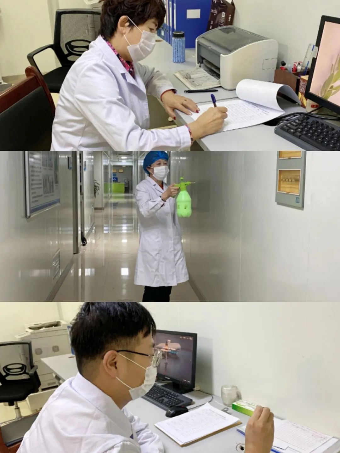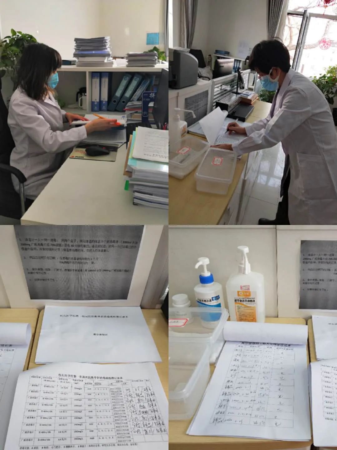 其他人员虽然没被选派,但也在坚守岗位,做好本职工作。因不通公交车,家住的较远的老师,每天只能步行或骑自行车上下班,往往来时已经累的气喘吁吁,但他们依然乐此不疲。对办公场所的消毒工作也是疫情防控的关键环节,他们每天上下午两次对办公室、走廊、楼道、楼梯把手进行消毒,并做好记录,保证每天办公环境的清洁。根据医院工作要求,全院科室周末需要有人在岗值班,大家主动报名,放弃休息时间,要求周末来院值班……