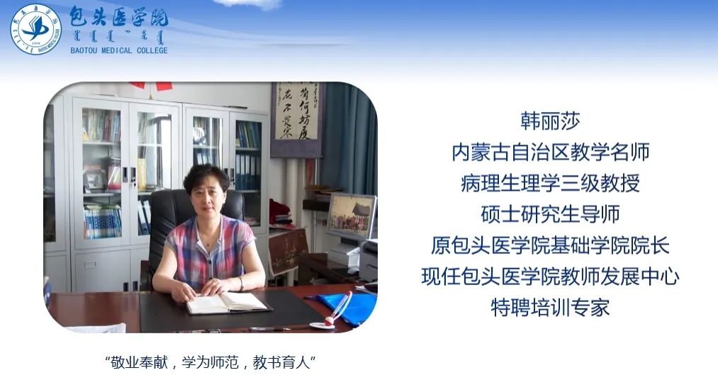 本次培训会邀请内蒙古自治区教学名师、三级教授、硕士研究生导师、原包头医学院基础学院院长、现包头医学院教师发展中心特聘培训专家韩丽莎讲解医学高等教育教学改革研究项目申报要领和注意事项。