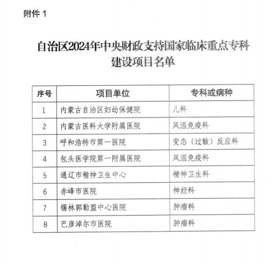 日前,内蒙古自治区卫生健康委印发《内蒙古自治区卫生健康委办公室关于印发2024年中央财政支持国家临床重点专科建设项目实施方案的通知》,并公布自治区2024年中央财政支持国家临床重点专科建设项目名单,包头医学院第一附属医院风湿免疫科获批2024年度中央财政支持国家临床重点专科建设项目,也是包头市唯一获此殊荣单位。