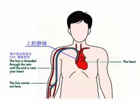 (4)因导管可直接进入上腔静脉,此处血流量大,可迅速降低液体渗透压或化疗药物造成的局部组织疼痛,坏死,静脉炎等。