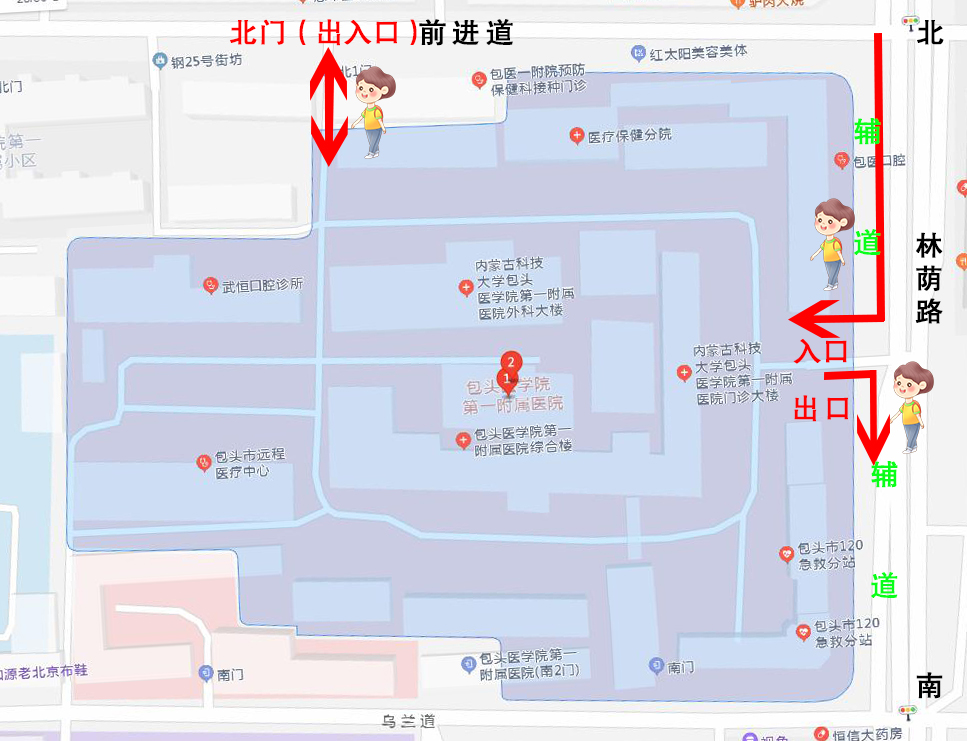 根据包头市公安局交通管理支队通告内容,2022年6月18日至11月30日期间,林荫路(莫尼路-富林路)段道路施工。为便于患者就诊,经过一周的路线试运行,医院根据实际情况,合理调整入院路线,6月26日起,您可选择驾驶机动车或步行等方式来院就诊,具体路线如下: