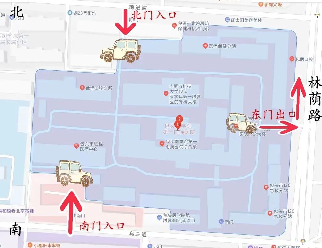 您可由医院北门(前进道开口)或南门(乌兰道开口)进入。