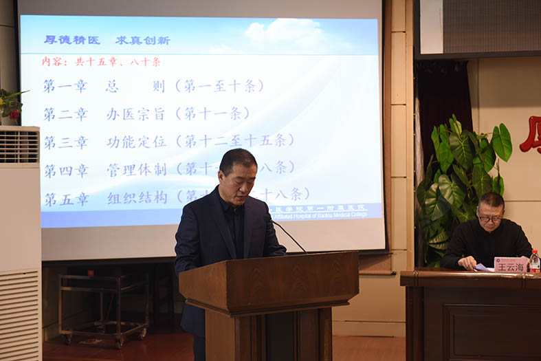 党委副书记、院长霍建新指出,在全面深化公立医院改革之际,为更好地推进现代医院管理制度,国家卫健委于今年5月发布《关于开展制定医院章程试点工作的指导意见》,我院是自治区指定制定医院章程的试点医院之一。他指出,医院章程是医院依法自主办院、实施管理、履行公益性的基本纲领和行为准则,将是医院办医的纲领性文件,承载了一附院精神,彰显了一附院使命,是我们全院、全体一附院人的行为准则和共同的奋斗目标。他强调,章程实施后,医院党委将充分发挥领导核心作用,抓好政治、思想和组织领导,抓大局、保落实、把方向,以章程为统领,建立健全医院管理制度,让医院科学健康发展,维护医院的公益性,更好地承担以人民健康为中心的崇高使命。他强调,全院广大干部职工要充分理解医院章程的内涵和外延,深入学习贯彻章程,积极响应习近平总书记“建设亮丽内蒙古,共圆伟大中国梦”的号召,不忘初心厚德精医为人民,牢记使命求真创新勤耕耘,为把我院建设成为科学文明、人道和谐的现代化服务型医院而努力工作。