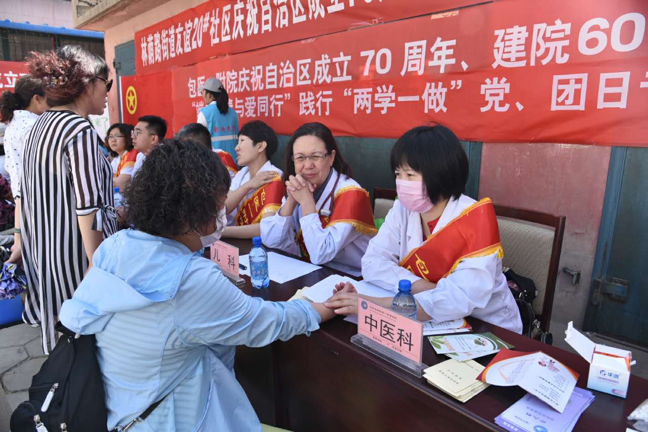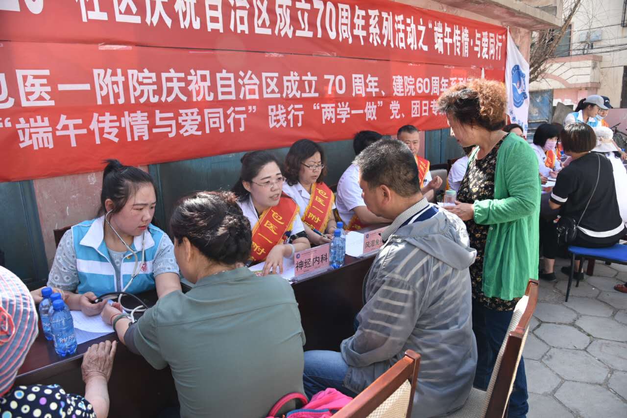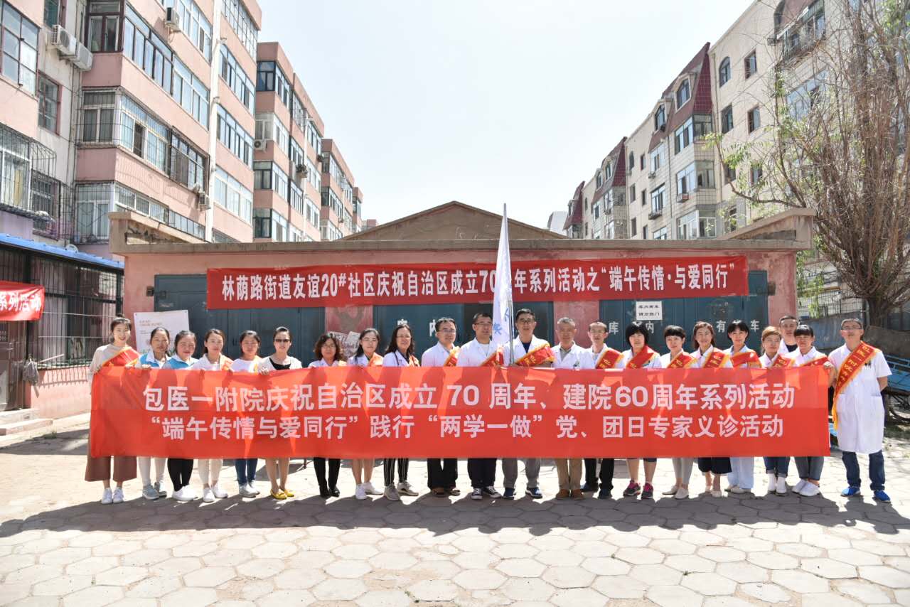为庆祝自治区成立70周年、我院成立60周年,结合医院“青年建功十三五,青春献礼十九大”青年文明号开放周活动安排,在端午佳节来临之际,2017年5月27日,我院作为包头市红十字会志愿者应急服务队,联合包头市红十字会来到昆区友谊20社区开展“端午传情·与爱同行”践行“两学一做”及“我为庆祝自治区成立70周年作贡献”党、团日专家义诊活动。我院各级青年文明号集体急诊医学科、神经内二科、风湿免疫科、骨科四病区及普外科、妇产科、儿科、中医科、病房超声科和学生党支部共23名党员、团员及青年志愿者参加了活动。