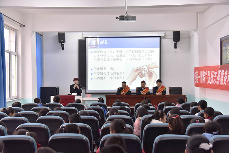 活动中,急诊医学科杨叶副主任针对“三不伤害事故预防原则”和小学生在生活中较为常见的眼睛异物、运动伤害、擦伤、碰伤、扭伤、鼻出血等危急情况以及简单的急救知识和技能进行了讲解。讲座内容浅显易懂,图文并茂,生动活泼,课堂气氛活跃,赢得了在场师生的阵阵掌声。
