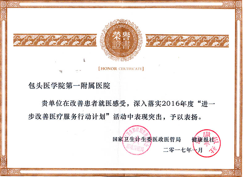 自国家卫生计生委开展“进一步改善医疗服务行动计划”以来,我院有序推进医疗服务改善工作,从基本入手、基层做起,注重人文关怀,不断提高管理水平,创新服务模式,提升服务质量,改善人民群众看病就医体验,提高患者满意度,为推进包头市民生幸福工程建设做出了积极贡献。