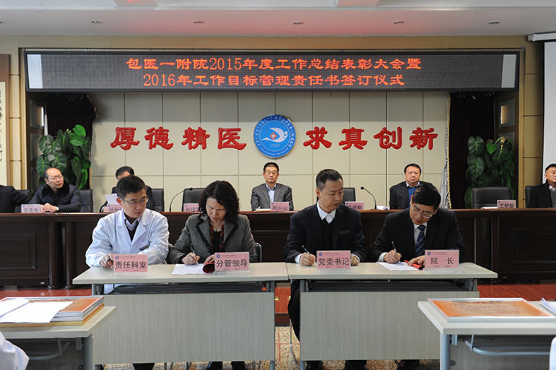 为全面回顾“十二五”时期医院取得的工作成绩,认真总结2015年各项工作,表彰先进,鼓舞干劲,安排部署“十三五”和2016年工作任务,谋划和展望未来,动员全院干部职工进一步解放思想,努力工作,全面推进我院各项工作顺利发展,2016年1月27日,我院在医学影像科三楼会议室隆重举行2015年度工作总结表彰大会暨2016年工作目标管理责任书签订仪式。包头医学院党委副书记、院长赵云山应邀出席会议。会议由我院党委书记、副院长孙建功主持。