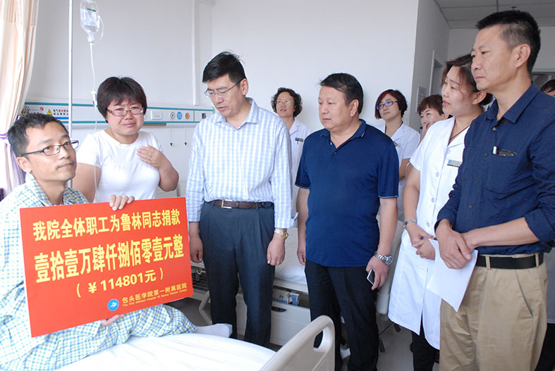 9月7日上午,由院长霍建新、副院长董乐乐、工会主席王云海,前往病房亲手将114801元爱心捐款交到鲁林手中,并转达了全院职工对他的关心和慰问。