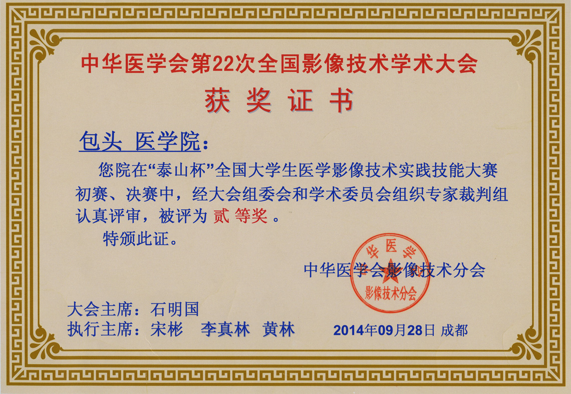 由中华医学会影像技术学会主办,泰山医学院承办的第二届全国高等医学院校大学生影像技术大赛于9月21日落下帷幕,我院代表包头医学院首次参赛。由普通放射、CT、MRI带教老师组成的培训团队针对2010级影像本科的学生进行了为期二个月的集中培训。派出的四名学生最终取得大赛团体总分二等奖、两项个人二等奖、两项个人优秀奖的优异成绩。 (包医一附院教学科)