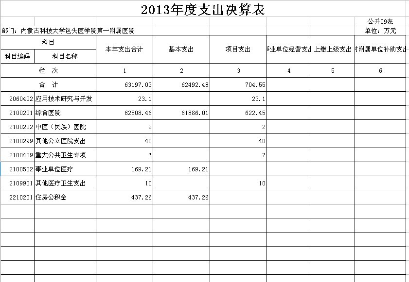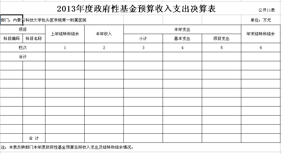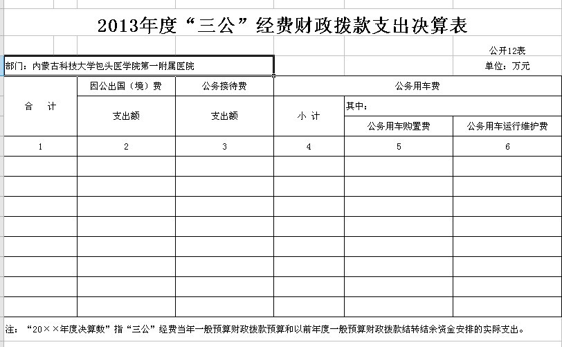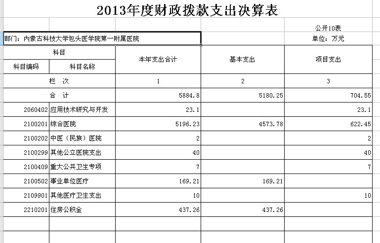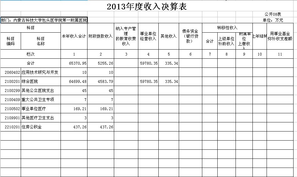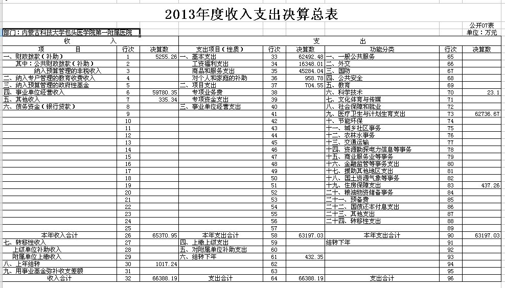 根据《包头市本级部门预决算和“三公”经费预决算公开工作方案的通知》(包府办件)的要求,内蒙古科技大学包头医学院第一附属医院现将2013年有关决算予以公布: