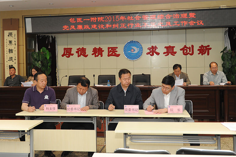 会上,党委副书记、纪委书记、副院长董乐乐宣读《关于对2014年度各科室社会管理综合治理达标情况的通报》。院领导与责任科室代表签订了《包医一附院2015年社会管理综合治理责任书》和《包医一附院2015年党风廉政建设和纠正行业不正之风工作责任书》。