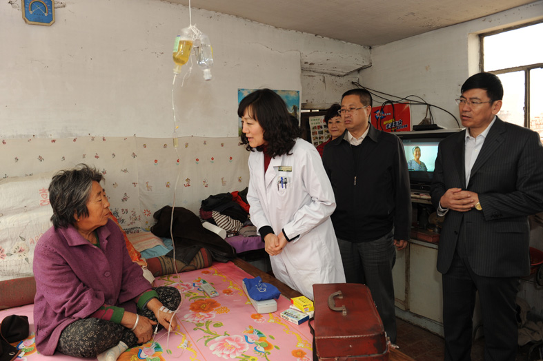 在义诊过程中,当得知有一位老人因病卧床无法前往义诊现场时,院领导立即带领神经内二科刘丹副主任赶往老人家中,详细地询问了老人的病史,耐心地为老人进行体格检查,并对症开展用药指导。细心的诊治,宽慰的话语,深深地感动了在场的每一个人。
