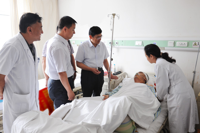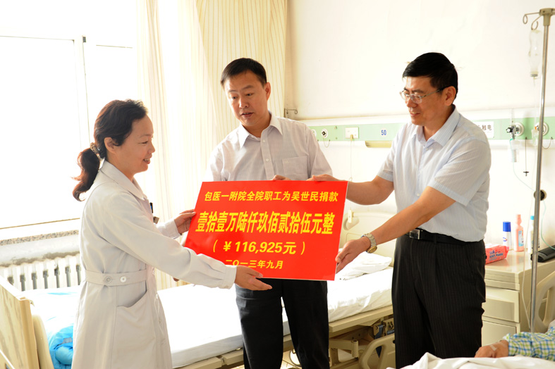 2013年9月17日,我院党委书记孙建功,党委副书记、院长霍建新一行带着全院广大干部职工的祝福前往神经外科病房看望我院职工吴世民。2013年7月23日,我院职工吴世民、祁美萍一家在回家途中,不幸发生交通事故,医院党政得知消息后,向全院职工发出了号召,为其捐款。全院广大干部职工积极响应,纷纷伸出援助之手,经过十几天的募捐,共募集人民币116925元。