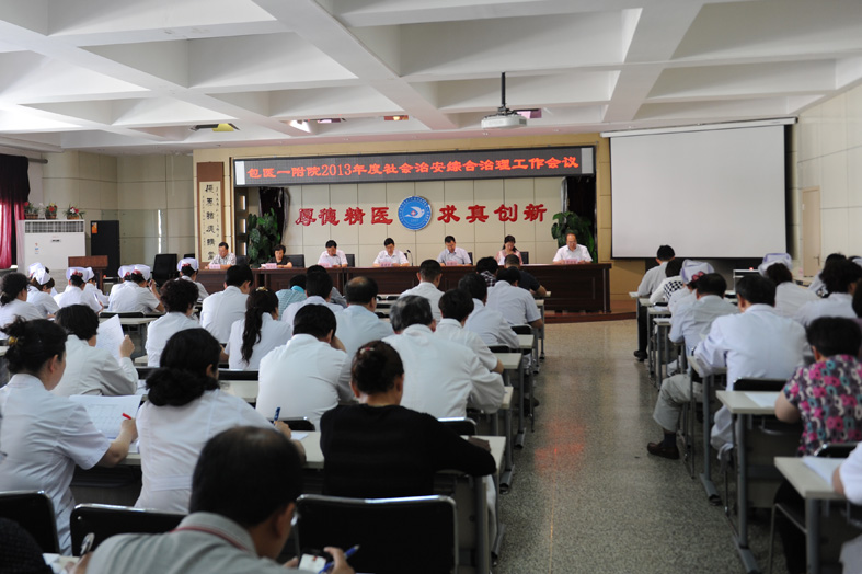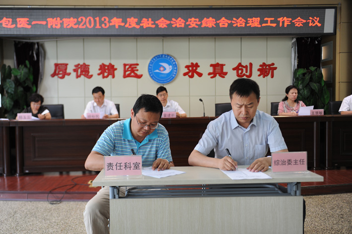为进一步做好社会治安综合治理工作,切实维护医院稳定,推进医院发展建设,更好的为患者服务,2013年5月31日,我院在医学影像科三楼会议室召开2013年度社会治安综合治理工作会议,安排部署我院2013年度社会治安综合治理工作,并与目标责任科室代表签订责任状。会议由院长霍建新主持。