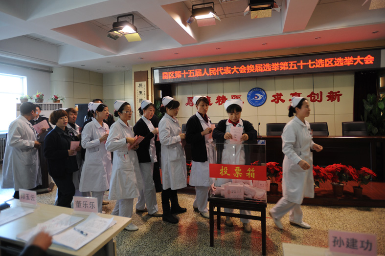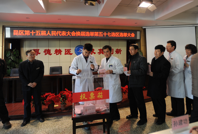 经过近两个月的紧张筹备,“昆区第十五届人民代表大会换届选举第57选区选举大会”于11月12日下午3时在我院影像中心三楼会议室隆重举行。我院党政办公室主任张慧恩同志主持会议,医院2321名选民投票选举出孙雅博、郭元虎同志为昆区第十五届人大代表。
