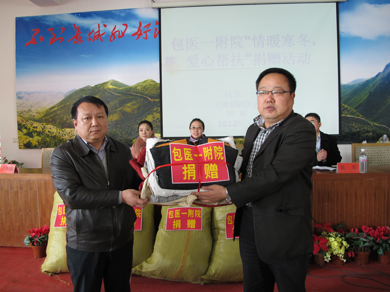 2012年11月20日,我院党委副书记、副院长董乐乐带领党政办公室、团委青年志愿者和内分泌科、呼吸内科、妇科、神经内科、风湿免疫科医务人员赴固阳县第三中学开展“情暖寒冬、爱心帮扶”活动。2012年11月1日至11月6日,我院号召全院广大干部职工向固阳县贫困学生捐赠爱心棉衣。期间,共有56个科室职工捐赠棉衣总计500余件。