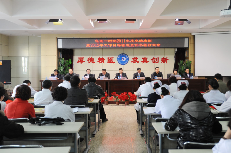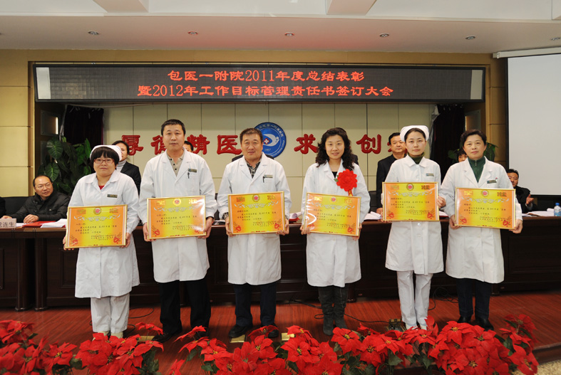 霍建新院长全面总结了2011年工作情况,并对2012年的目标任务、工作重点进行了安排部署。他在讲话中指出,在全院广大干部职工的共同努力下,医院圆满完成了2011年各项工作任务,医院晋升为全国文明单位,被评为2011年度医院改革创新奖,肾内科被评为全国青年文明号,院党委被内蒙古高校工委评为先进基层党组织,自体免疫学实验室被自治区科技厅评为重点实验室。肾脏内科学、神经外科学、风湿免疫病学、眼科学、血液内科学、中医内科学、蒙医骨伤学被评为包头市领先学科,骨外科学、产科学、麻醉学、介入放射学、神经内科学、皮肤与性病学、内分泌学、心血管内科学、消化内科学、临床传染病学被评为包头市重点学科。他要求,全院广大干部职工要以目标管理为抓手,以三甲医院评审为契机,深化医院改革,以病人为中心,以质量为核心,确保医疗安全,进一步加强医院文化建设,巩固全国文明单位成果,在上级党委和行政的正确领导下,锐意改革,奋发图强,为建设科学文明、人道和谐的现代化服务型医院而不懈努力,以优异的成绩向党的十八大胜利召开和医院建院55周年献上一份厚礼。