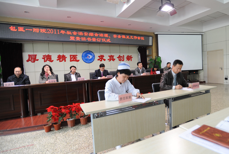 党委书记、社会治安综合治理委员会主任孙建功与代表科室负责人签订了2011年社会治安综合治理工作目标管理责任书,并作了重要讲话。他指出,2010年我院在综治和安全保卫工作中,坚持因地制宜,一切从实际出发的原则,合理利用有效资源,做到防患与应急处理相结合,取得了较好的成绩。他强调,各科室要高度重视综治和安全建设工作,切实把综治工作摆在更加突出的位置,进一步健全领导责任制、按照“谁主管谁负责”的原则,把综治工作的责任和任务分解到各科室,落实到具体责任人,形成一种主要领导亲自抓,分管领导负责抓,相关人员全力抓的工作机制和氛围,强化措施,要紧紧围绕医院总体发展目标,严格按照综治工作要求和平安医院创建标准扎实开展工作,进一步建立健全各项规章制度,强化管理,加强防范,进一步加强医疗质量安全生产和服务,加强医德医风建设,加强医患沟通,加强对重点要害部位的监控和管理,加强计算机网络的安全管理,加强对有毒、易燃、易爆等危险品的管理,大力加强普法工作,深入开展法制宣传教育,提高干部职工的法律素质,加大对院内交通安全、消防安全的治理力度,加快平安医院建设的步伐,以构建平安医院为主题,以社会治安综合治理长效机制建设为核心,以进一步加强医院综治工作为重点,扎实推进综治各项工作,为医院的建设和发展创造和谐稳定的环境。