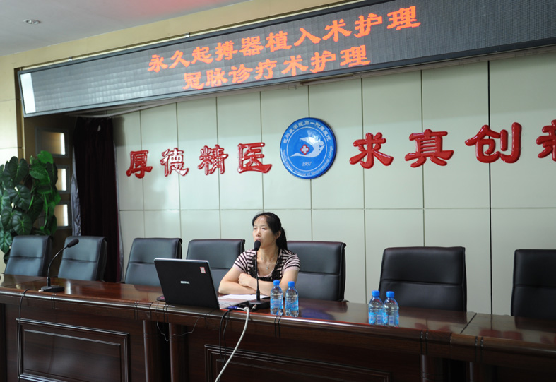 培训班特邀湖南大学湘雅医院导管室孟霜媛教授作专题讲座。培训中,孟霜媛教授针对如何进行导管室的管理、怎样提高导管室的工作质量及永久起搏器植入术和冠状动脉介入诊疗术患者的护理工作进行了专业指导。此次培训,使全院护士对导管室护理工作有了进一步认识,并对提高我院护理质量具有重要意义。