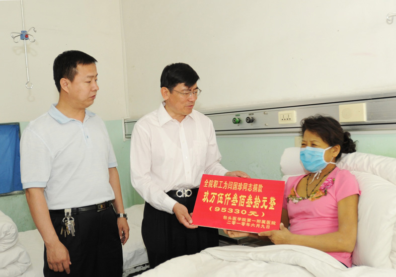 6月10日上午,院长霍建新、党委书记孙建功带着全院职工的祝福,到感染疾病科看望物理诊断科副主任兼教研室副主任闫国珍,并将全院广大干部职工的爱心捐献款送到她的手中。