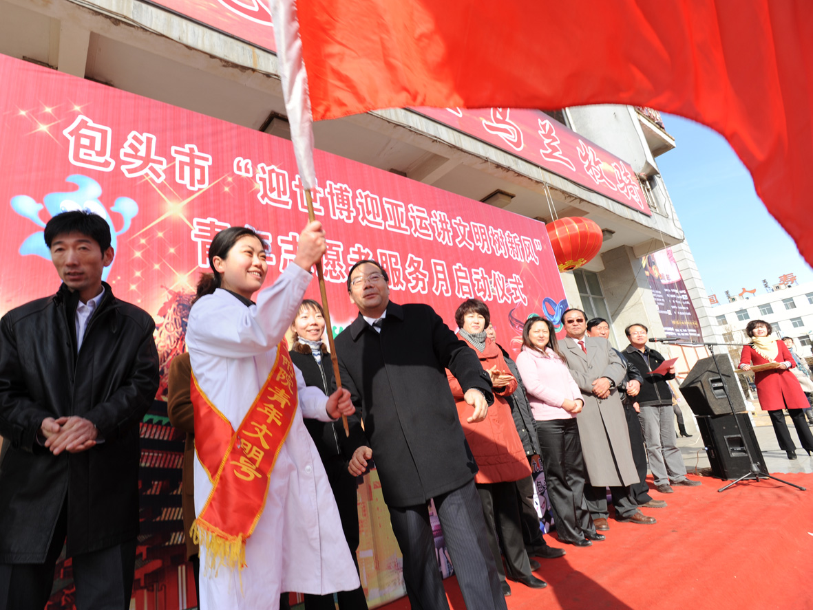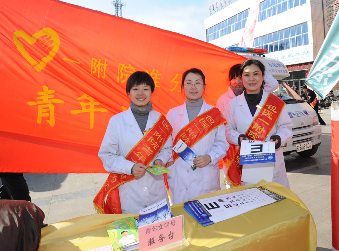 3月5日上午,由共青团包头市委员会组织开展的“迎世博迎亚运讲文明树新风”青年志愿者服务月活动正式启动。院团委积极响应号召,组织青年文明号集体——准分子激光治疗室的青年志愿者到九原区开展义诊宣教活动。启动仪式上,人大常委会副主任白同伦向我院青年志愿者服务队授旗。