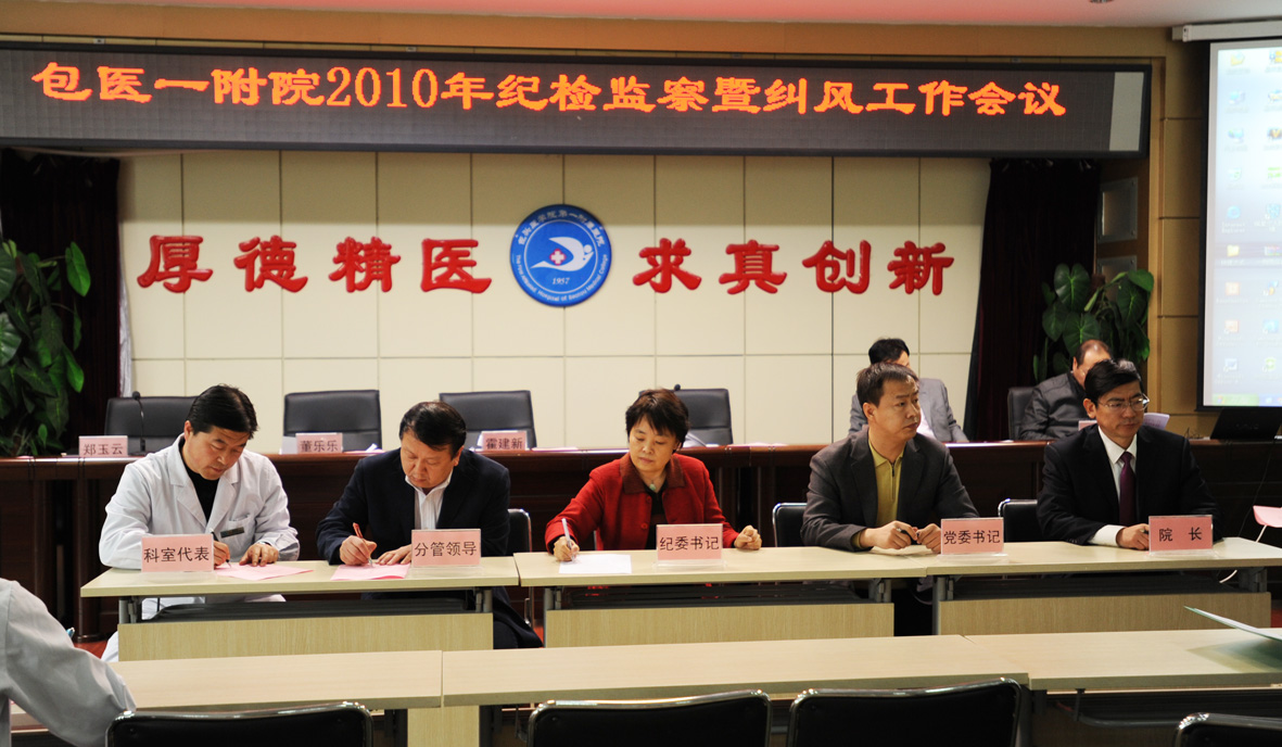 会上,院长霍建新、党委书记孙建功、纪委书记郑玉云与分管领导和科室主任代表签订了《包医一附院2010年党风廉政建设和纠正行业不正之风责任书》。