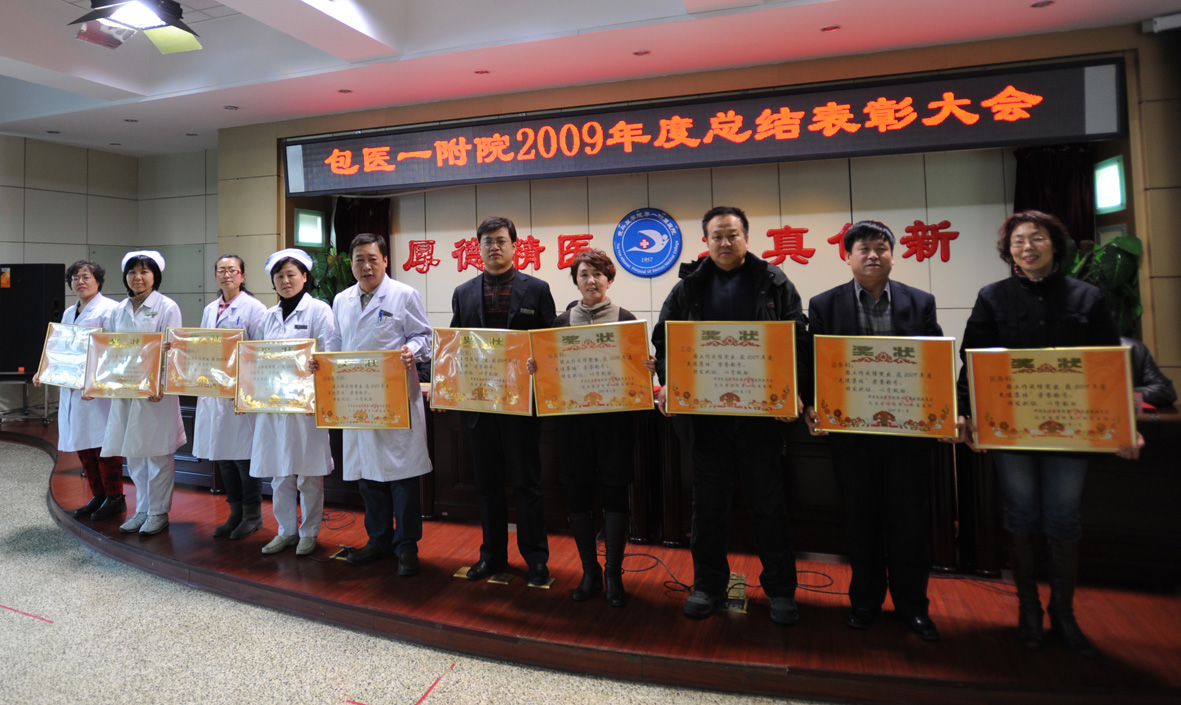 会上,党委书记米占彪宣读了《包医一附院关于2009年度“人均结余奖”、“先进集体”及“先进个人”等的表彰决定》。大会还通报了我院2009年度获奖情况及我院2009年度十件大事。院领导对获奖集体和先进个人代表颁发了奖状和荣誉证书。