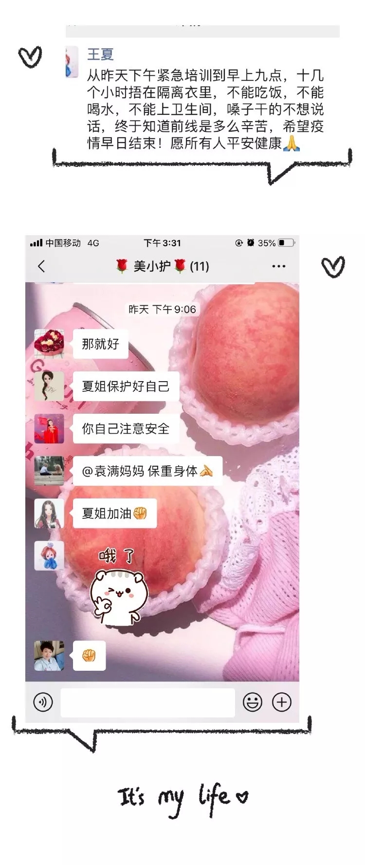 感染科任务繁重,隔离衣又十分宝贵,为了节省资源,我们的护士坚持十几个小时不吃不喝,不上厕所,科里的姐妹们知道情况后都纷纷为之加油打气。