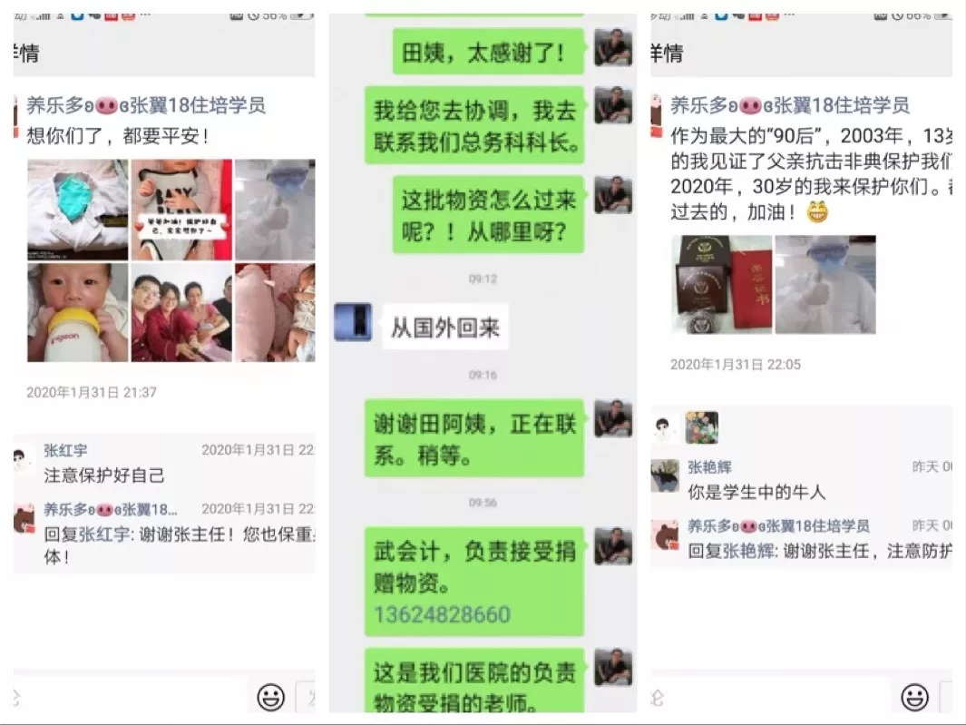 同舟共济,休戚与共。面对重大疫情,住培医师团队表现同样令人刮目相看。16名住培医师春节期间放弃与家人的团聚一直坚守在防控一线。他们纷纷表示: “我们也是医护队伍的一份子,如今疫情当前,这是我们的责任和使命,冲上前线才不负医者初心。”内科专业基地张冀医师主动参与发热门诊工作;全科专业基地贺伟医师主动返回送出单位参与防控工作;李玲霞、李卓鹏几名医师主动返回工作岗位,积极参与到防控工作中......我们在微信中收到多位住培医师的留言,讲述参与疫情防控的感受,表达对疫情防控工作的关注,并主动联系捐助医用物资。