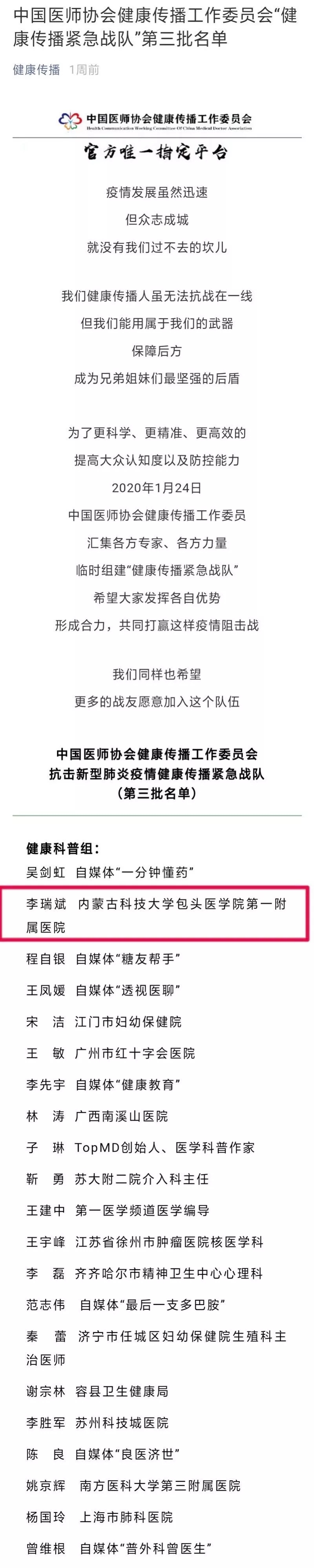随着新冠肺炎疫情发展迅速,为了更科学、更精准、更高效的提高大众认知度及防控能力,近日,中国医师协会健康传播工作委员会汇集各方专家、各方力量组建“健康传播紧急战队”,我院普外科一病区李瑞斌医生凭借其公众号的健康传播影响力入选中国医师协会健康传播工作委员会“健康传播紧急战队”(第三批)健康科普组,以健康科普为“武器”保障后方,成为一线医护兄弟姐妹的有力支撑。众志成城,汇聚合力,共同打赢新冠肺炎疫情阻击战!