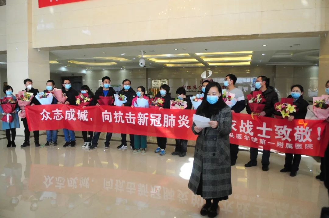 党委书记石继海在讲话中指出,在这场新冠肺炎疫情防控阻击战中,我们的医疗队员是救死扶伤的白衣天使,更是不畏险阻的白衣“战士”!你们舍小家、顾大家,逆风前行,你们体现了医者的情怀和大爱无疆的精神,体现了一附院广大医护人员“召之即来、来之能战、战之能胜”和“厚德精医”的精神。有你们,就有医院美好的明天;有你们,我们就不怕任何的困难和险阻;有你们,我们就有战胜病魔的决心和希望!他强调,疫情还在继续、战斗还将进行。相信我们每一位医务工作者都能在这特殊的时期发挥自己的所长、自己的能力去战胜病魔,圆满完成包头市、包头医学院及医院党委、行政赋予你们的光荣任务。你们无愧于英雄的称号!你们是新时代最可爱、最可敬的人!只要我们众志成城、团结一心,我们一定能够打赢这场疫情防控阻击战!