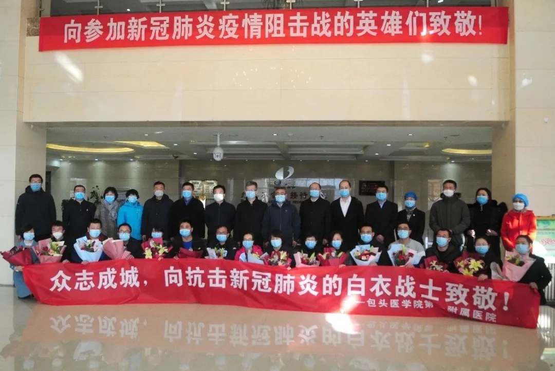 2020年2月25日上午,包头医学院第一附属医院党委书记石继海,党委副书记、院长王秋枫带队来到包钢疗养院,代表全院干部职工及战“疫”勇士家属,迎接在这里即将结束隔离休整的首批16名新冠肺炎重症患者医疗救治队员凯旋回家。