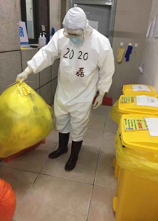 2月3日,我接到通知,需要支援感染疾病科开展工作,负责医疗垃圾的处理、封存,负责所有防护用品的消毒处理,负责感染疾病科办公区的消杀工作……总之,我要为所有一线医护人员做好严格的后勤保障工作,保证最前线的兄弟姐妹的安全。大家可能觉得我的工作小小不言,又脏又累,危险性还高,还不被人们关注。但我觉得,疫情面前,再细小的工作都是为打赢这场没有硝烟的战争而不可或缺的环节,哪一种工作都需要有人去做。我是男子汉,有比女同志更能胜任此项工作的优势,我必须做好我的本职工作,保证每一个细微的环节都不能放过,我尽心尽责的努力着。凭借着往常在手术室的工作历练,隔离病区里8小时不吃不喝不上厕所对于我来说也能很快的适应。虽然我的工作没有像一线战“疫”英雄拯救患者生命那般惊心动魄,但在我心里,它与每一台救人于生死的手术没有什么不同,我也是这场战“疫”的一份子。