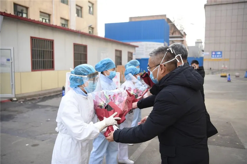 ↑ 包头医学院第一附属医院工作人员给医护人员献花。