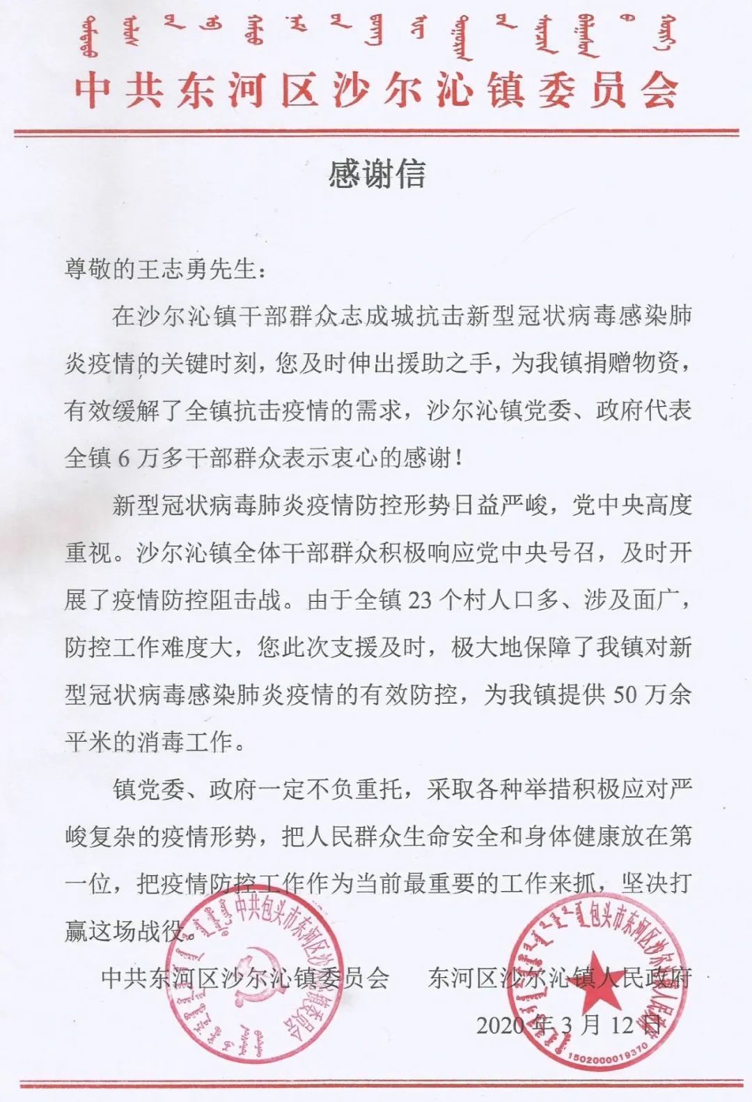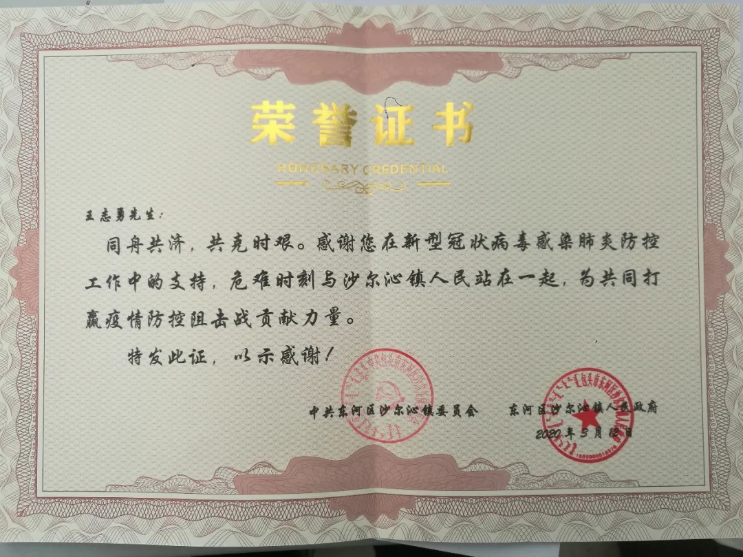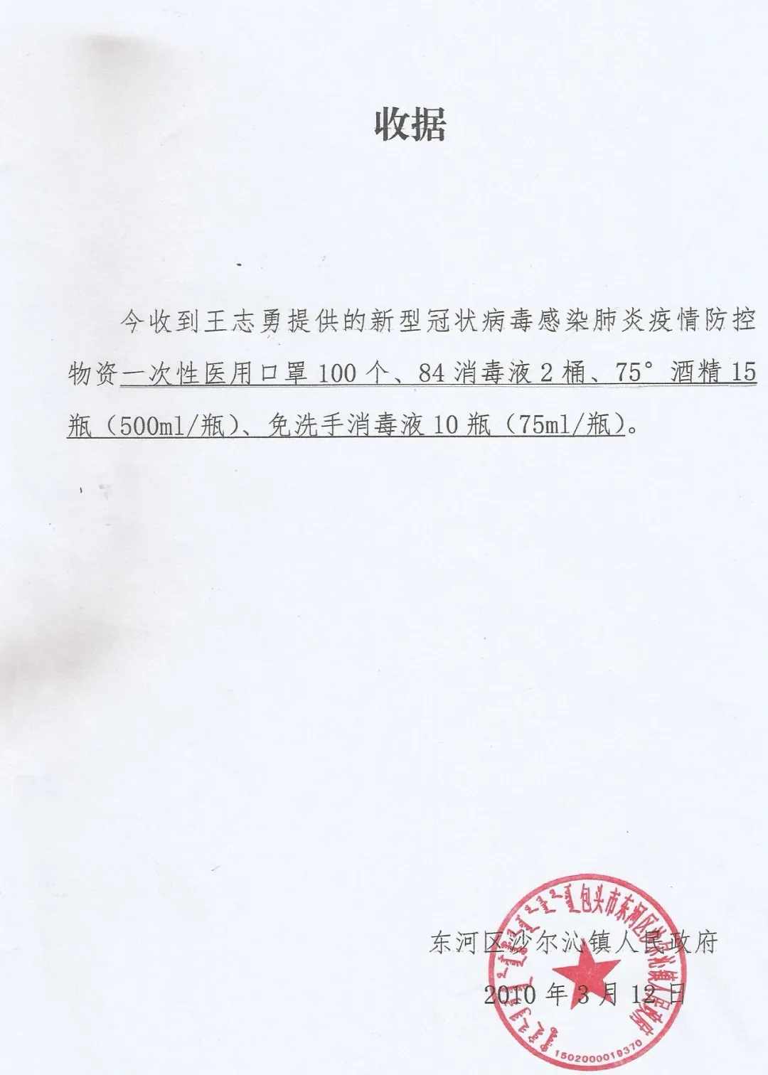 100个一次性医用口罩、2桶84消毒液、15瓶75%酒精、10瓶免洗洗手液,这些疫情期间一物难求的防控物资,是王志勇多处求购的宝贝。2020年3月6日,他将这些供不应求的物资送到了包头市东河区沙尔沁镇政府工作人员的手中。