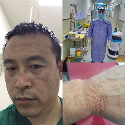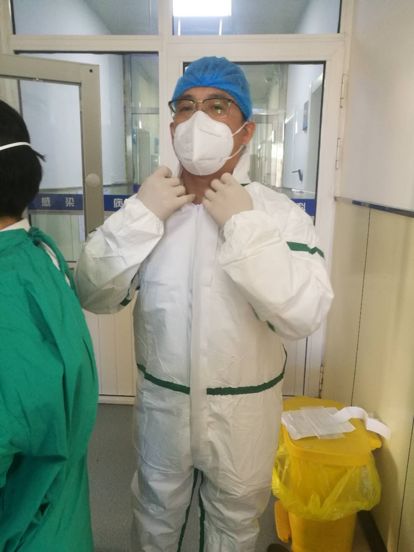 新冠肺炎无特效药物,以往没有任何治疗经验。目前治疗上以对症支持为主。医疗组6人,每日进病房,查看病人,向专家组汇报病例,书写医疗文书,严密监测病情变化,护理组共11人,两人一组,进入病区护理患者,每六小时轮换一次,工作量非常大,非常辛苦。在病区,必须要做好防护,穿上防护服后行动迟缓,呼吸不畅,视听受限,密不透风,浑身湿透,无形中增加了工作难度。为了节省资源,最大限度发挥防护服的作用,我尽量不喝水!由于反复洗手导致皮肤皲裂、过敏。鼻梁、耳朵被口罩压伤,疼痛难忍,轻伤不下火线,年逾古稀的老母亲知道我来抗疫第一线,电话一遍又一遍的叮嘱………我是儿子,是丈夫,是父亲,但我更是医务工作者,大疫当前,责无旁贷!