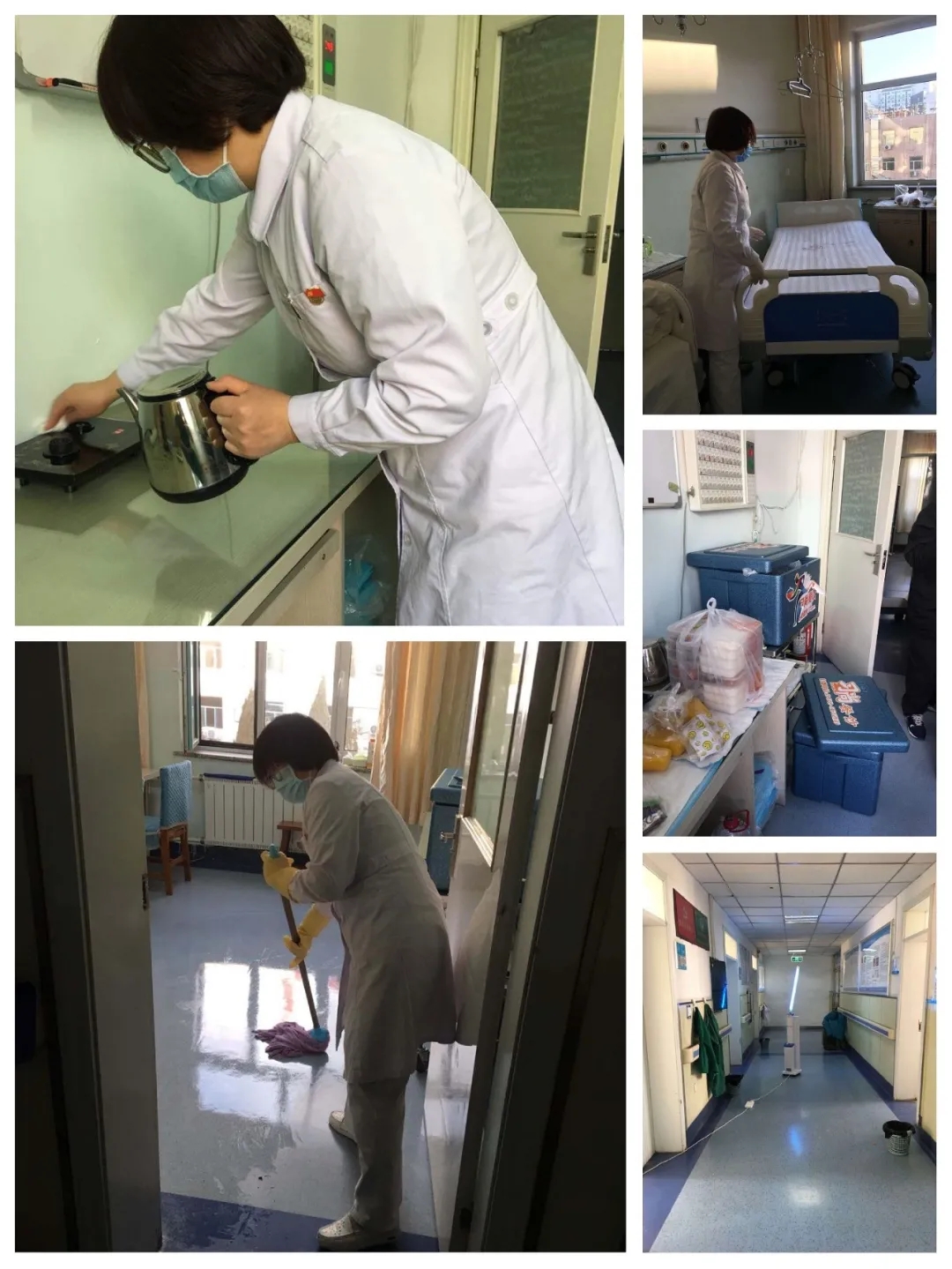 2月11日,还在工作中的卢皓护士长接到去发热门诊和隔离病房生活区支援的任务。交代好手头的工作,来不及和家里人说一声,护士长就匆忙地赶去进行工作交接。第二天一早正式上岗,主要负责发热门诊、隔离病房等一线医护人员的生活区安排、管理工作。简单来说就是每天安排他们的生活起居、区域消杀、营养供给,保障一线的医护人员在上岗前、下班后有份热饭吃,有杯热水喝,有个安全温馨的休息场所,有份真诚温暖的关爱。