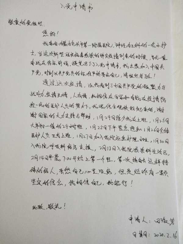 为了更好的实现自我价值,在战“疫”一线,她郑重的写下了入党申请书,她在入党申请书中写道:“通过这次疫情,让我看了中国共产党的凝聚力与战斗力。我相信,在国家和所有奋战在疫情防控一线医护人员的共同努力下,一切都会好起来……我始终抱有坚定的信念,我相信自己,我能行!”