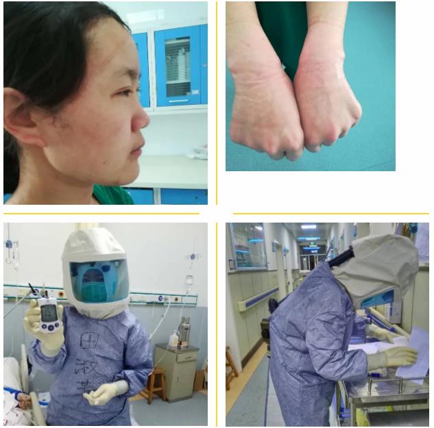 每天6小时的工作,加上交接班、穿脱防护服,将近8小时滴水不进,还要完成各项护理操作;穿着厚重的防护服,楼上楼下搬运医疗垃圾;护目镜上的雾气,导致穿刺等操作极度困难……这些困难都被她一一克服,圆满完成了各项工作任务。即便被汗水湿透衣衫,即便脸上留下深深的压痕,她依然觉得无怨无悔。虽然苦、虽然累,但是当她和她的战友们将两名确诊患者治愈并送出院后,田淑芳觉得自己的努力没有白费,这一切都是值得的。