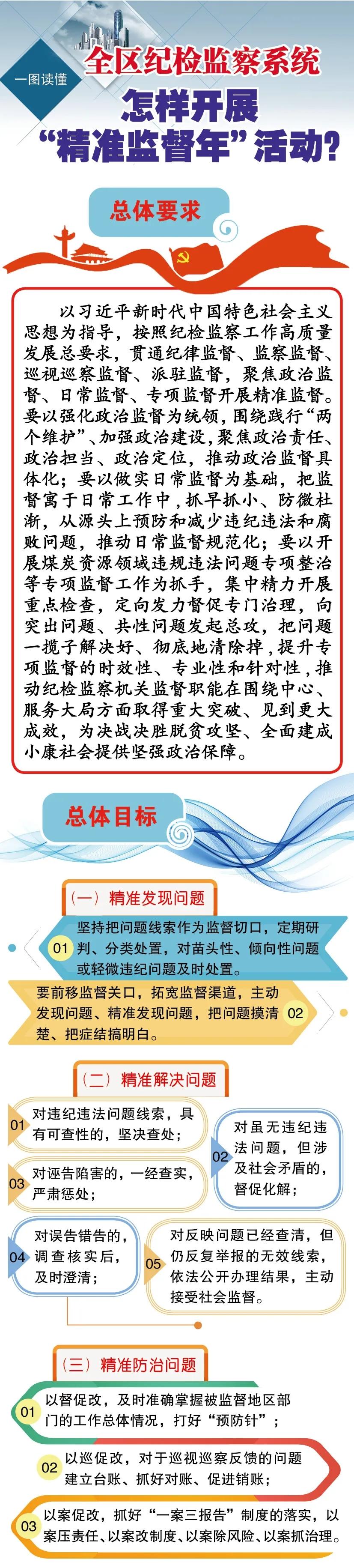 全区纪检监察系统开展“精准监督年”活动是自治区十届纪委六次全会做出的重要部署,本次活动以强化政治监督为统领,做实日常监督为基础,开展专项监督为抓手,本着精准发现、解决和防治问题的总体目标,要求全区各级纪委监委围绕权力运行各个环节,注重源头治理,精准分类施策,把建好监督底单、政治生态评价、大数据应用、权力运行公开、一抓到底、专业人才培养六项机制作为工作重点。坚持严管厚爱结合、激励约束并重。推动纪检监察机关监督职能在围绕中心、服务大局方面取得重大突破、见到更大成效,为决战决胜脱贫攻坚、全面建成小康社会提供坚强政治保障。