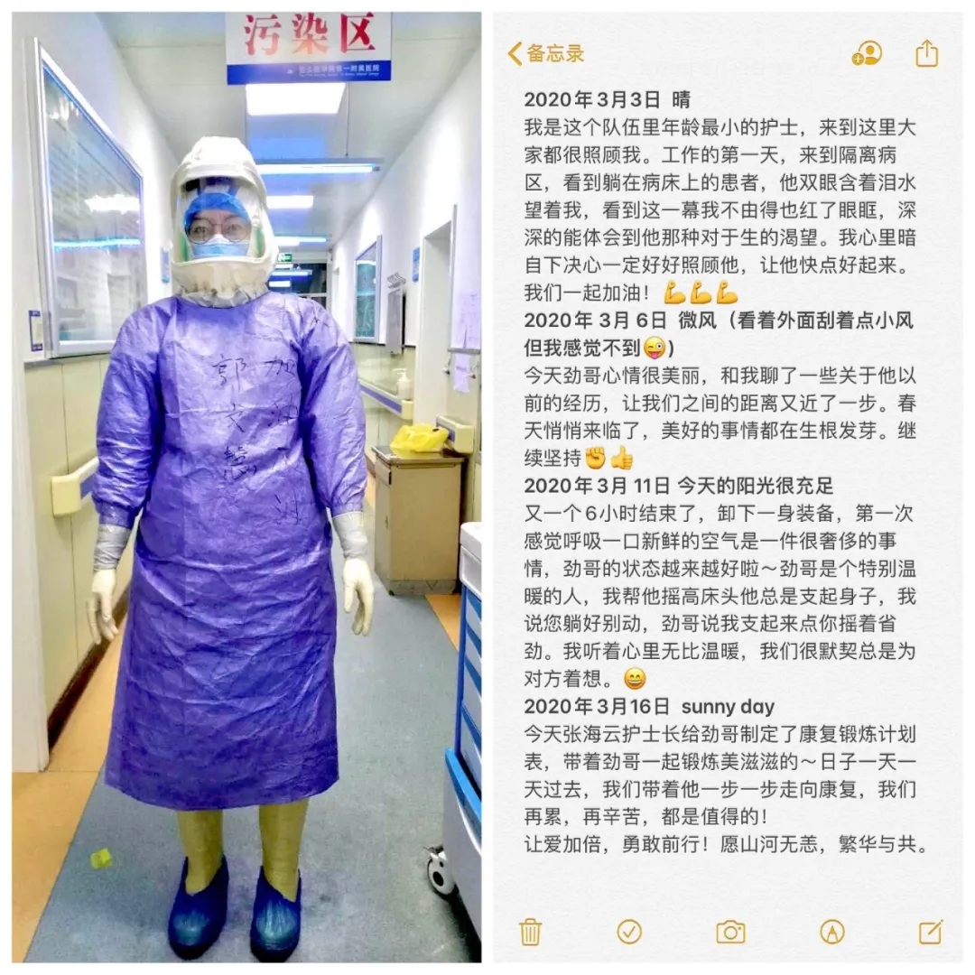 看到患者的状态越来越好,我特别开心。患者老大爷是个特别温暖的人,每次我帮他摇高床头他总是支起身子,我说:“您躺好别动”,大爷却说:“我支起来点你摇着省劲儿。”听他这样说我心里无比温暖,我们总是互相为对方考虑着想,这样的默契也是在这次疫情中医患之间彼此信任、相互依赖中积累出来的。
