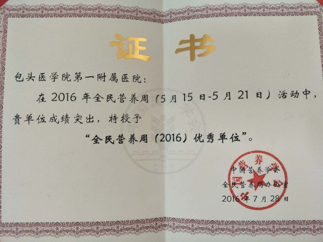 在全民营养周活动中,我院先后被中国营养学会评为“全民营养周(2016)优秀单位”、“2017年全民营养周基层服务奖”、“百家‘全民营养周工作’优秀医院”。