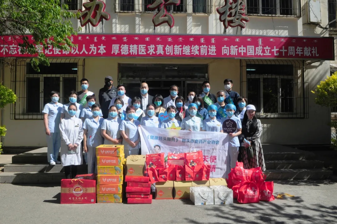 同行的华美医疗美容医院、包头市荣华食品有限公司、蜜拓蜜内蒙古亿佳医疗科技有限公司、包头市明远食品有限责任公司、包领鲜优选及内蒙古万昌食品公司六家企业为我院护理人员赠送了价值一万余元的慰问品,并表示,值此护士节来临之际,希望能够以慰问的形式表达对护士队伍的关心和爱护,为护理人员送去温暖与爱心,同时向医院全体护理人员致以节日的祝福和崇高的敬意。