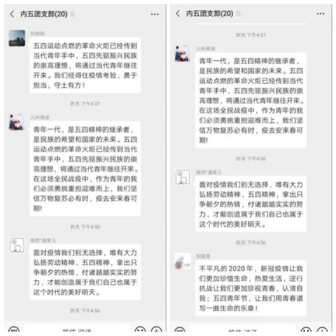 医院多个团支部组织开展以“弘扬五四精神,致敬抗疫青春”为主题的云团课学习,各团支部团员积极参加、热烈讨论,并就战疫青春发表感想。