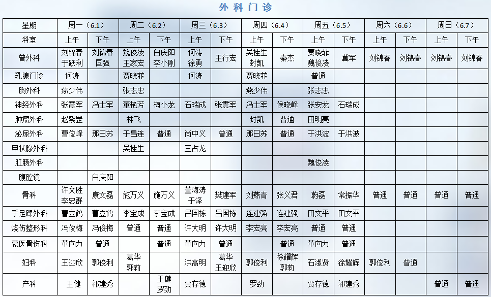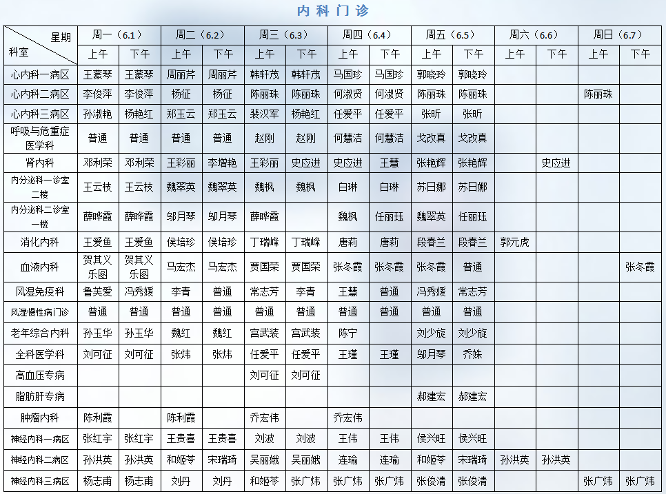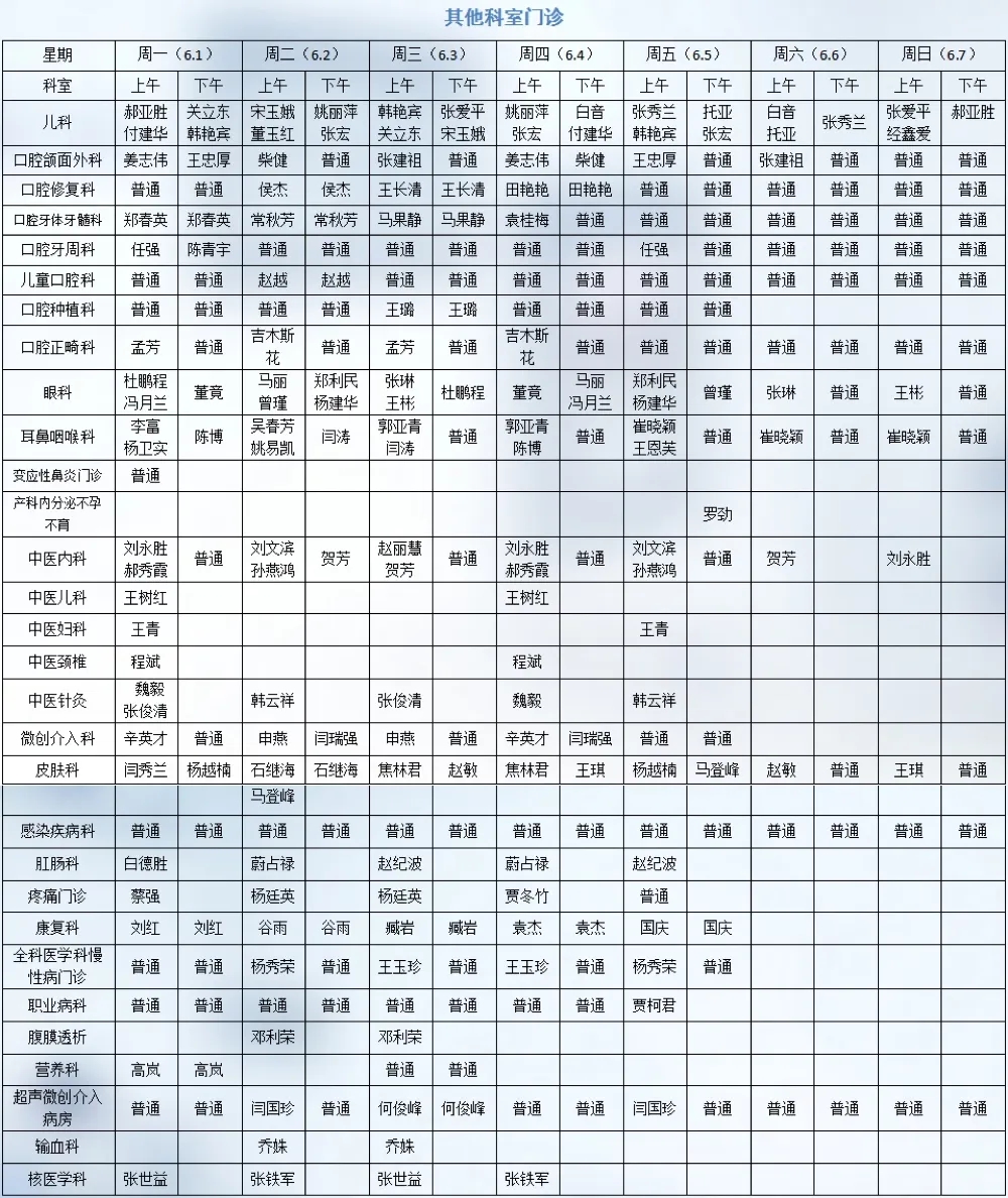 【便民服务】包头医学院第一附属医院2020年六月第一周门诊排班表,请查收!