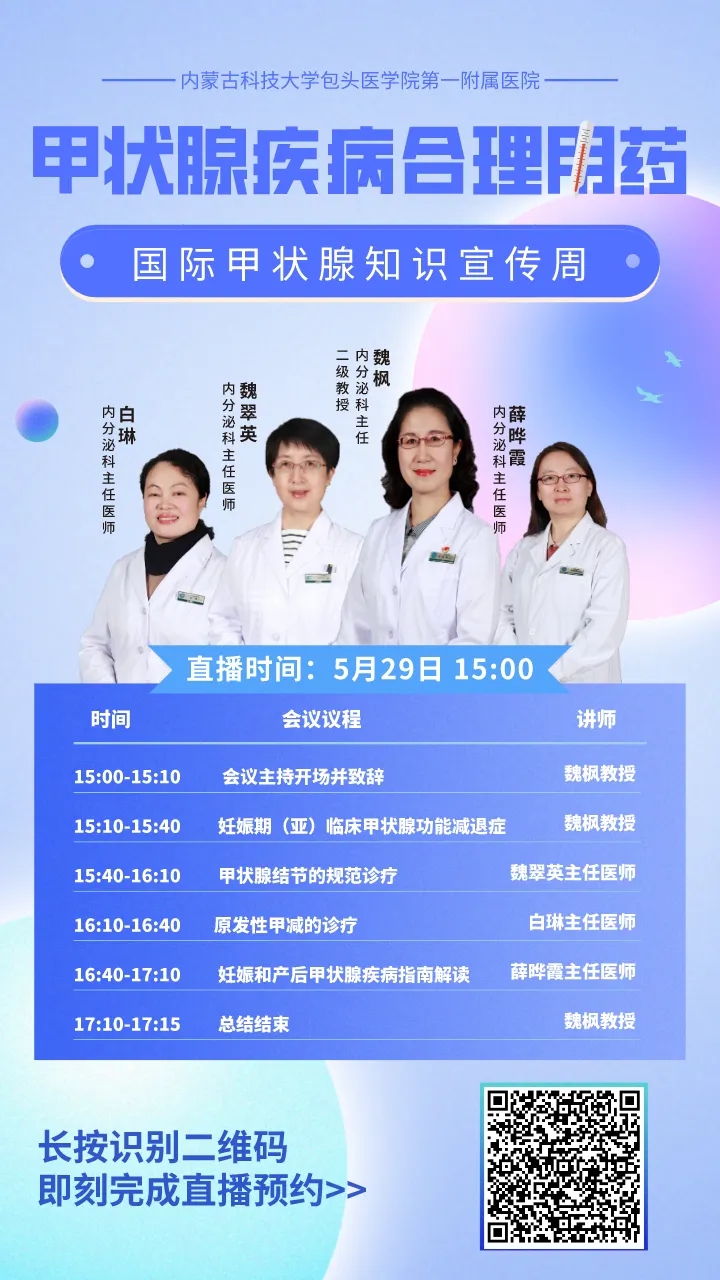 为了提高公众对甲状腺疾病的认知,帮助患者接受科学的疾病常识及规范化治疗,值此国际甲状腺知识宣传周之际,包医一附院内分泌科特举办 “2020年国际甲状腺知识宣传周—甲状腺疾病合理用药”宣教活动,共同守护您身体中的”小蝴蝶“。