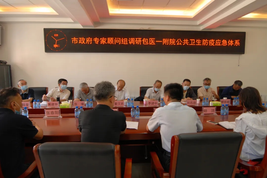 2020年6月30日上午,以原市政协主席董汉忠为组长的市政府专家顾问组一行8人莅临我院就公共卫生防疫应急体系运行情况进行专题调研。包头市卫生健康委党组成员、副主任王维峰,疾控科科长胡洁,医政科副科长斯日古楞陪同调研。我院党委副书记、院长王秋枫,副院长张春阳,各相关职能科室负责人参加了调研会议。