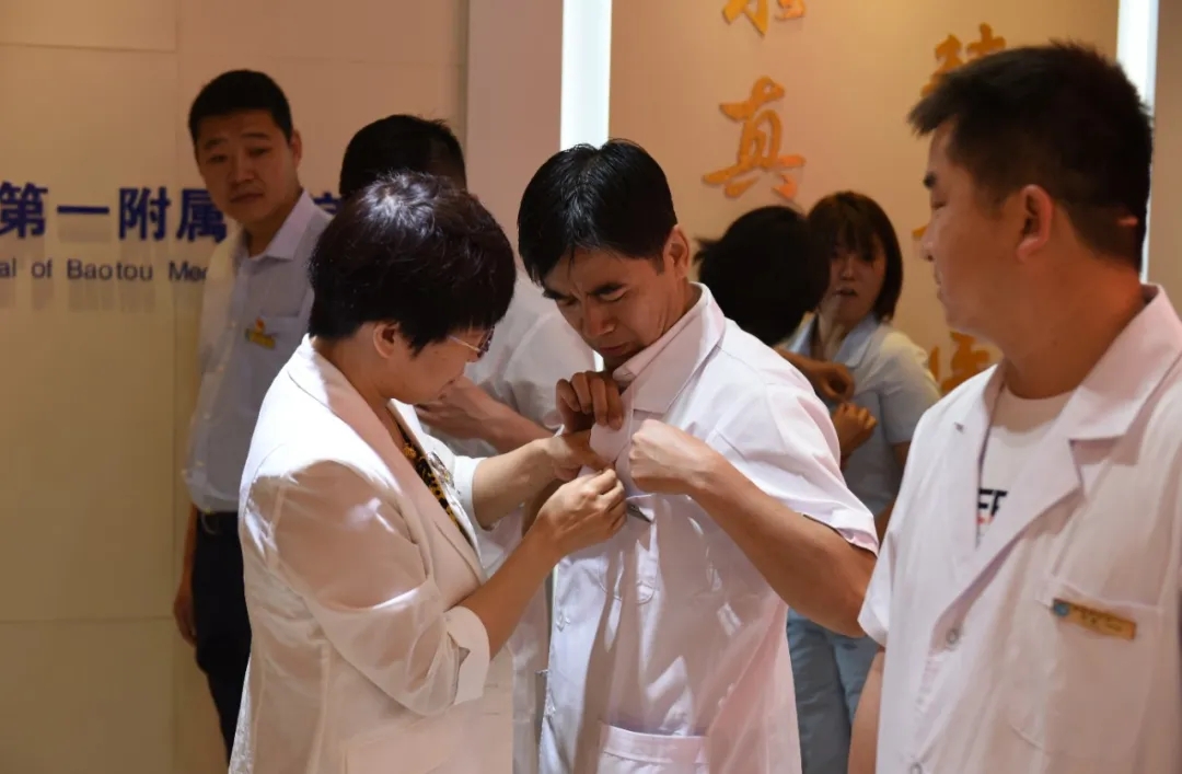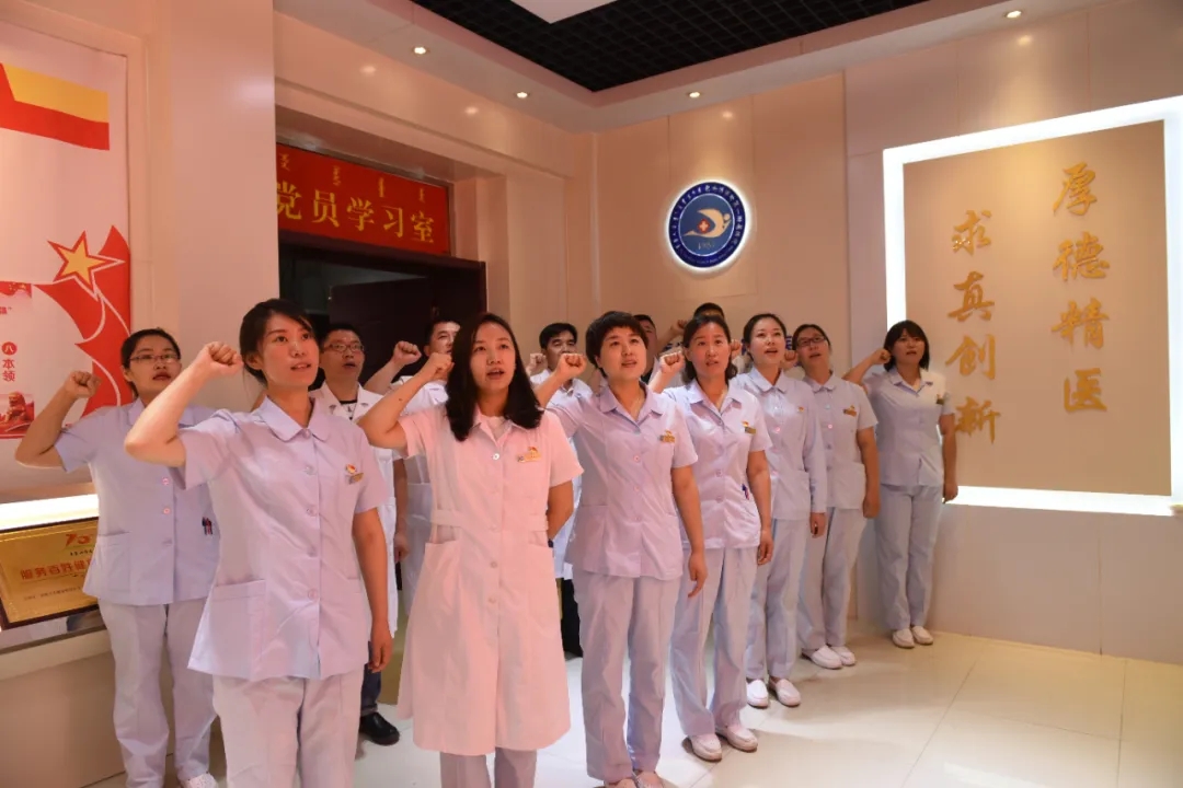 13名预备党员面对鲜红的党旗庄严宣誓,表达了他们对党的无限忠诚与热爱。党委委员、党委办公室主任苏琴和行政第五党支部书记、护理部主任孙雅博为预备党员佩戴党徽。