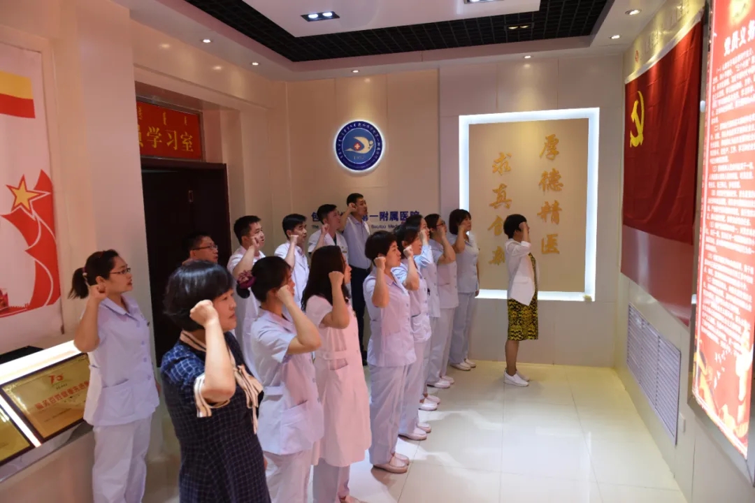 伟大的民族需要英雄精神的滋养,崇高的事业需要榜样引领的力量。在庆祝中国共产党建立99周年之际,为全面回顾党的光辉历程,讴歌党的丰功伟绩,进一步激励全院各党支部和广大共产党员,时刻牢记习近平总书记的殷殷嘱托,弘扬厚德精医、求真创新的精神,凝心聚力推动医院高质量发展,6月30日,医院在行政二楼党员学习室举办了入党宣誓活动和先进党支部授牌仪式。